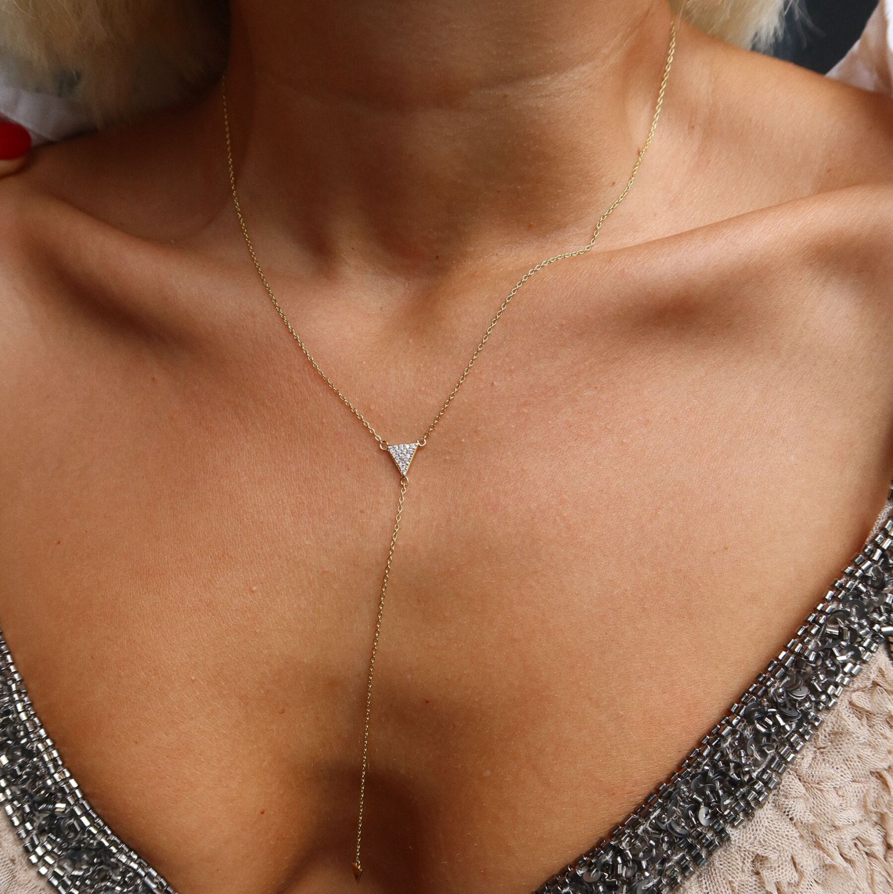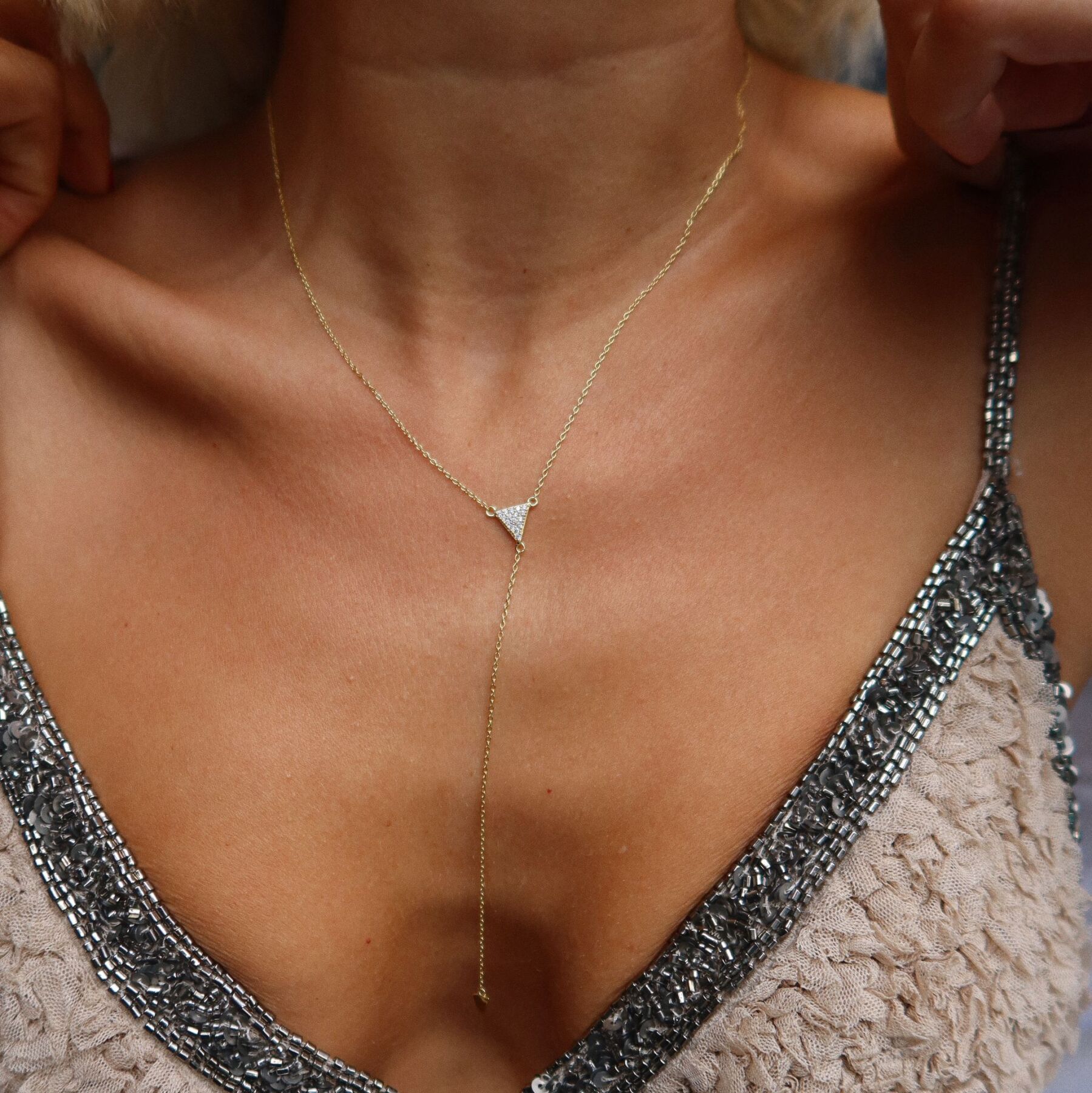 Taşlı Üçgen Y Zincir Kolye | 925 Gümüş