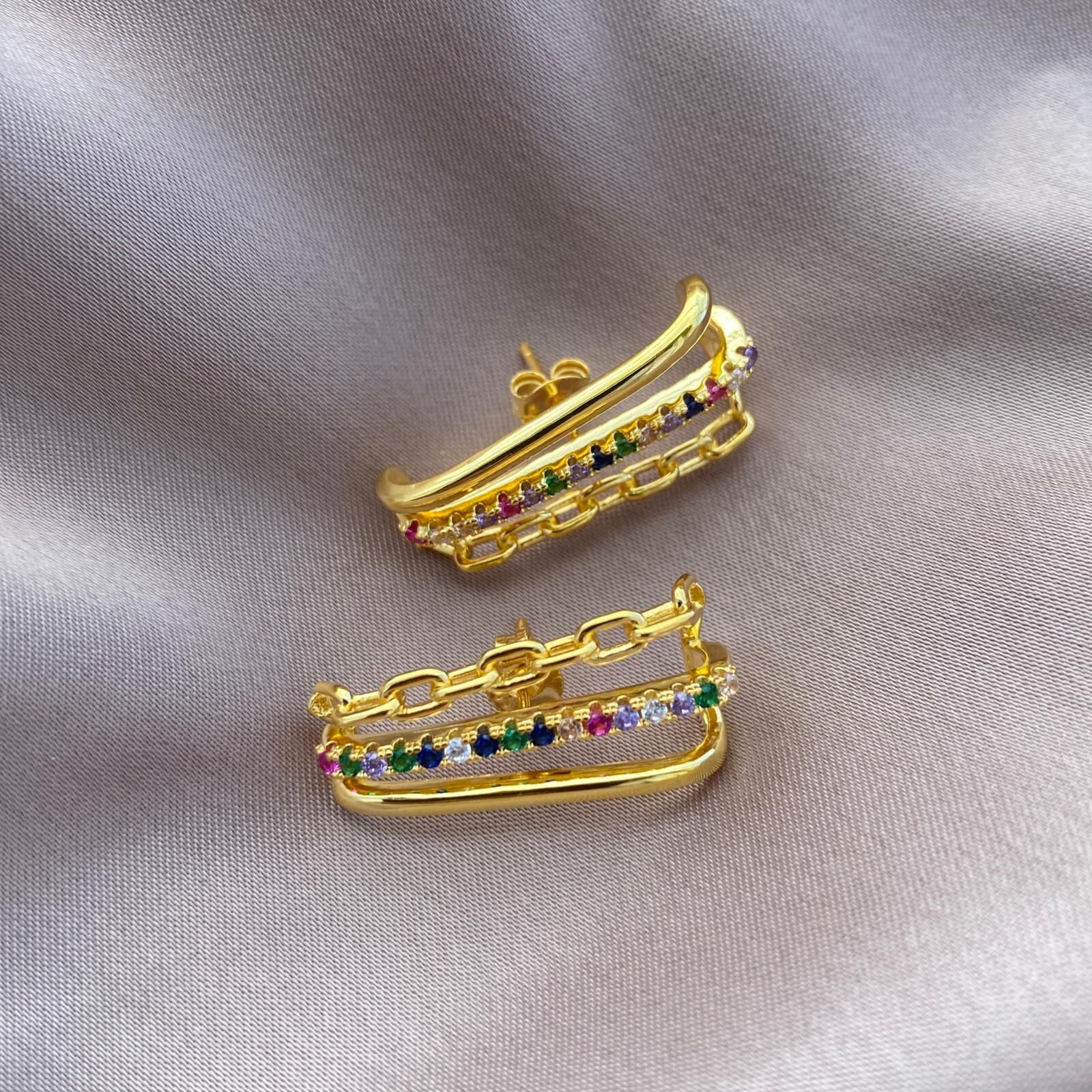 Zincirli Renkli Taşlı Kulağı Saran Küpe | 925 Gümüş